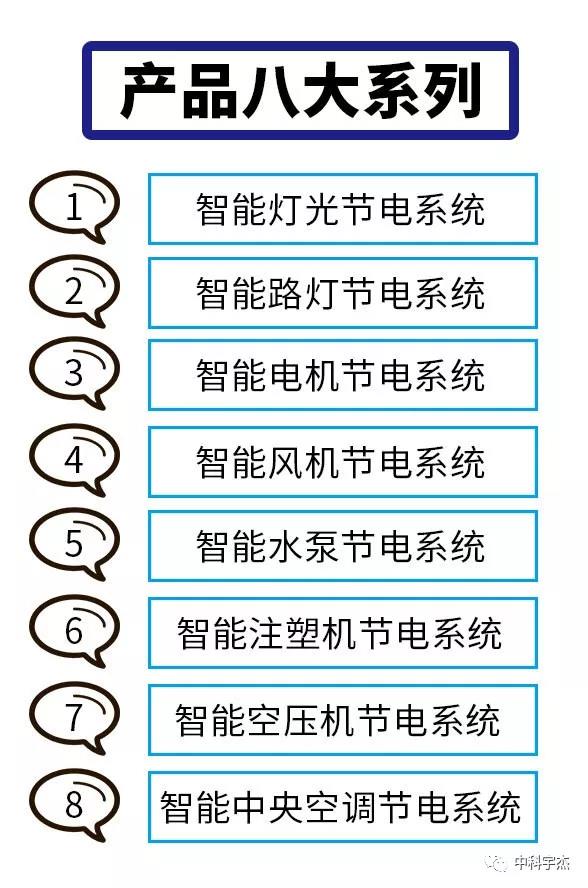 中科宇杰的產(chǎn)品以無(wú)縫式嵌入和智能化為核心,特別針對(duì)用能單位設(shè)備的特點(diǎn),在完全不影 響用能單位設(shè)備正常運(yùn)行和改變?cè)O(shè)備運(yùn)行參數(shù)的前提下,達(dá)到節(jié)電的目的,實(shí)現(xiàn)用能設(shè)備和中科宇杰節(jié)電機(jī)的無(wú)縫銜接,經(jīng)過(guò)十多年發(fā)展,中科宇杰的產(chǎn)品已經(jīng)形成了8大體系。