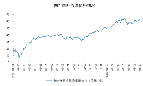? ? ? ?原油進口由升轉(zhuǎn)降,國際原油價格有所上漲。4月份,進口原油4036萬噸,同比下降0.2%;1-4月份,進口原油17958萬噸,同比增長7.2%。4月30日布倫特原油現(xiàn)貨離岸價格為67.73美元/桶,比3月31日的63.52美元/桶上漲6.6%。